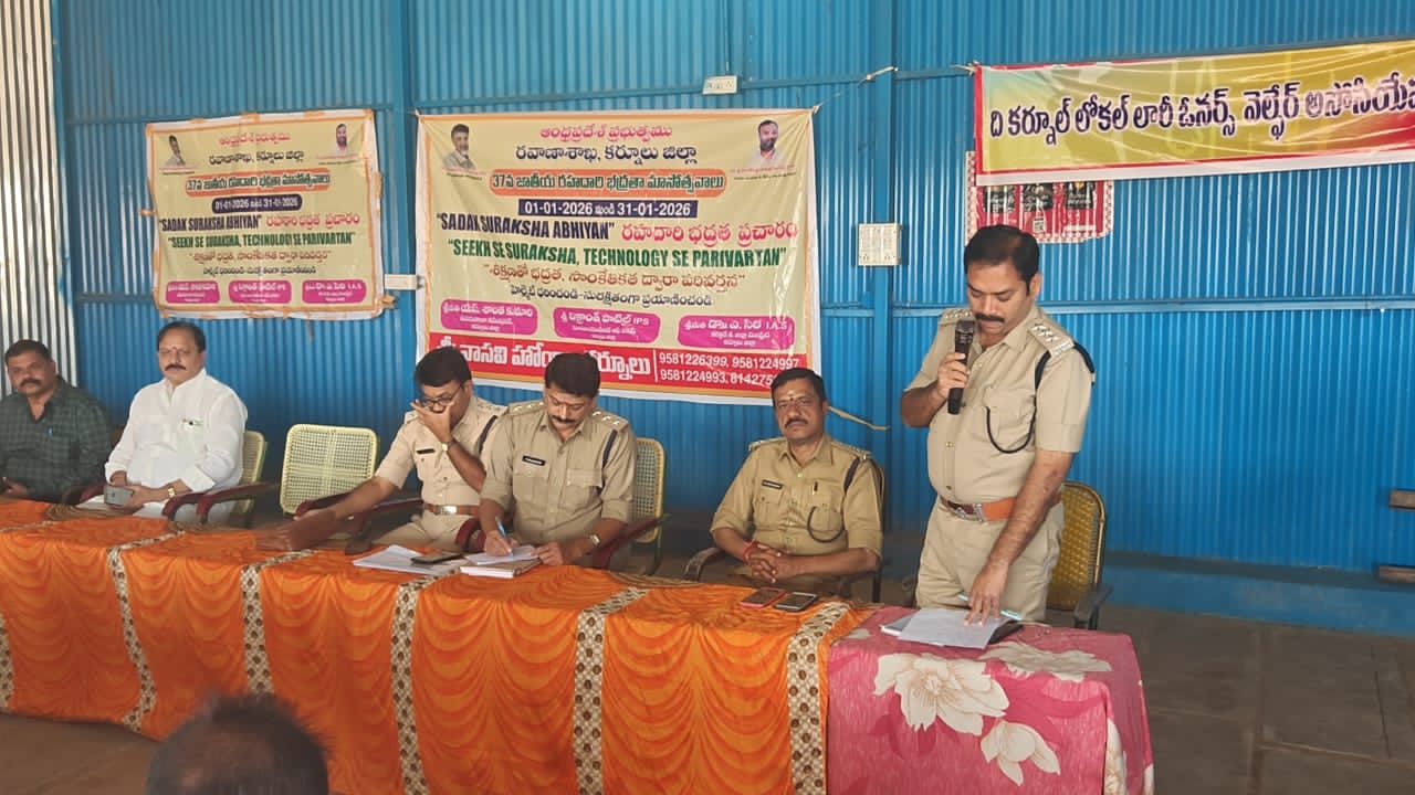 కర్నూలు, నగరంలో ఉప రవాణా కమీషనర్, ఆధ్వర్యములో 20న తేది లారీ ఓనర్స్ అసోసియేషన్ బిల్డింగ్ హాల్, బళ్ళారి రోడ్, కర్నూలు నందు లారి ఓనర్లకు, డ్రైవర్లకు మరియు ప్రజలకు రోడ్డు భద్రత గురించి, గుడ్ సమారిటన్ ప్రాముఖ్యత గురించి వివరిస్తూ ఏదైనా ఆక్సిడెంట్ జరిగినప్పుడు మొదటి గంట లోపు (గోల్డెన్ హవర్ లో) దగ్గరలో గల ఆసుపత్రికి తీసుకెళ్ళినచో కేంద్ర ప్రభుత్వము 25,000-00 నగదు ప్రోత్సహకాన్ని అందిస్తుందని తెలియచేసారు అలాగే లారీ డ్రైవర్లు సహనంతో ఓపిగ్గా డ్రైవింగ్ చేయాలని, ట్రాఫిక్ నియమ నిబంధనలు తప్పకుండా పాటించాలని, నేషనల్ హైవేస్ తీసుకోవలసిన జాగ్రత్తలు, మద్యము సేవించి, సెల్ ఫోన్ మాట్లాడుతూ వాహనము నడుపడము వలన కలిగే అనార్థాలగురించి, హెల్మెట్, సీట్ బెల్టు ధరించడము వలన కలిగే ఉపయోగాల గురించి అవగాహనా కల్పించడము జరిగినది మరియు తప్పకుండా రైట్ సైడ్ నుంచే ఓవర్టేక్ చెయ్యమని, లారీ లను తప్పకుండా లే బై లోనే ఆపాలని, హైవే పై ఎట్టి పరిస్థితుల్లో అపావదని, ప్రతి ఆరు నెలలు ఒకసారి కంటి పరీక్ష చేసుకోవాలని, లారీలకు డాష్ బోర్డు కెమెరా బిగించుకోవాలని తెలియచేసారు, సెంట్రల్ గవర్నమెంట్ ప్రవేశ పెట్టిన మొబైల్ యాప్స్ తర్వాత జెన్ మురివాహన్ మరియు డీజీ లాకర్ ద్వారా డ్రైవింగ్ లైసెన్స్ మరియు వాహన పత్రాలను చూపించాలని తెలియజేశారు. కర్నూలు జిల్లా లో మూడు డ్రైవింగ్ ట్రైనింగ్ సెంటర్స్ వస్తున్నాయని తెలియజేశారు. రోడ్డు భద్రత పైన ప్రతిజ్ఞ చేయించటము జరిగినది. ఇందులో మోటార్ ట్రాన్స్పోర్టు వెహికల్ అధికారులు కె. రవీంద్ర కుమార్, ఆర్.వి. మధుసూదన్, ఎస్. నాగరాజా నాయక్, ఎం.వి. సుధాకర్ రెడ్డి రవాణాశాఖ, కర్నూలు మరియు ఎస్. మన్సూరుద్దీన్, ట్రాఫిక్ ఇన్స్పెక్టర్ కర్నూలు, ఎన్జీవో సభ్యులు పాల్గొన్నారు
