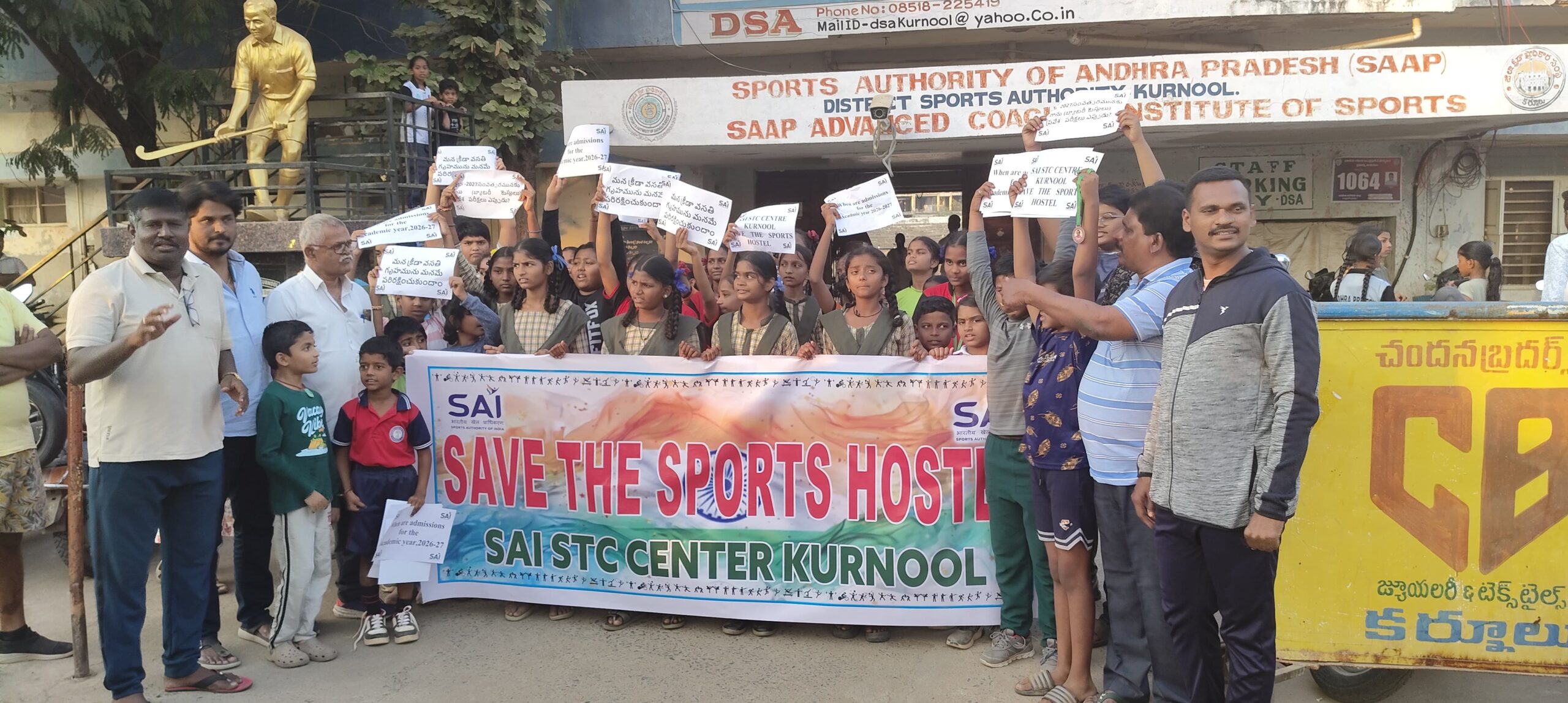 కర్నూలులో ఉన్న స్పోర్ట్స్ అథారిటీ ఆఫ్ ఇండియా శాయి హాస్టల్ కు అడ్మిషన్ నోటిఫికేషన్ విడుదల చేయాలని కోరుతూ శనివారం కర్నూలు అవుట్డోర్ స్టేడియం ఎదుట పెద్ద ఎత్తున క్రీడా సంఘాల ప్రతినిధులు,క్రీడాకారులు హాజరై నిరసన తెలిపారు. ఈ సందర్భంగా క్రీడా సంఘాల జేఏసీ నాయకుడు నాగరత్నమయ్య,జిల్లా ఒలంపిక్స్ సంఘం కార్యనిర్వాహక కార్యదర్శి సునీల్ కుమార్,బాక్సింగ్ సంఘం అధ్యక్షుడు సురేష్ గౌడ్,జిల్లా ప్రైవేట్ స్కూల్ వ్యాయామ ఉపాధ్యాయుల సంఘం అధ్యక్షుడు చిన్న సుంకన్న ,