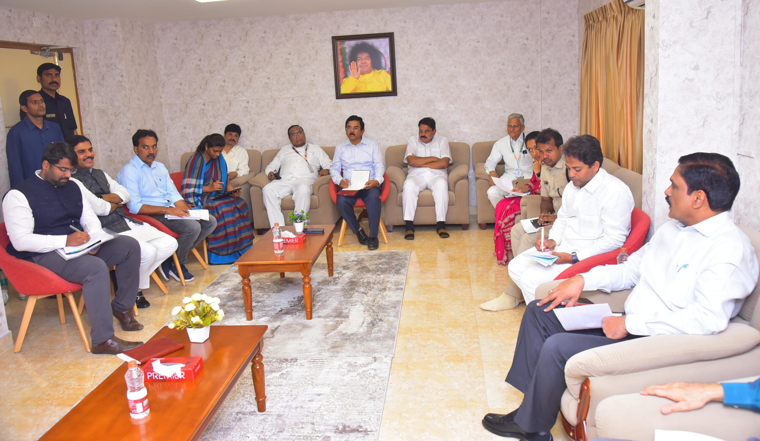 భగవాన్ శ్రీ సత్యసాయి జయంతి ఉత్సవాలకు పుట్టపర్తిలో చేపట్టిన పనుల ప్రగతిపై.. రాష్ట్ర మంత్రుల బృందం చైర్మన్ మరియు జిల్లా ఇన్చార్జి మంత్రివర్యులు అనగాని సత్యప్రసాద్, వైద్య ఆరోగ్యశాఖ మాత్యులు సత్య కుమార్ యాదవ్, దేవదాయశాఖ మాత్యులు ఆనం రామనారాయణరెడ్డి, ప్రభుత్వ ప్రత్యేక ప్రధాన కార్యదర్శిలు యంటి కృష్ణ బాబు, అజయ్ జైన్ లకు ప్రాథమికంగా పనుల ప్రగతిని వివరిస్తున్న జిల్లా కలెక్టర్ ఏ శ్యాంప్రసాద్, జిల్లా ఎస్పీ సతీష్ కుమార్. ఈ ప్రాథమిక సమావేశంలో… ఎమ్మెల్యేలు పల్లె సింధూర రెడ్డి, ఎమ్మెస్ రాజు, జాయింట్ కలెక్టర్ మౌర్య భరద్వాజ్, మాజీ మంత్రి పల్లె రఘునాథరెడ్డి, ఆర్డీవోలు సువర్ణ, వివిఎస్ శర్మ, ట్రస్టు సభ్యులు తదితరులు పాల్గొన్నారు