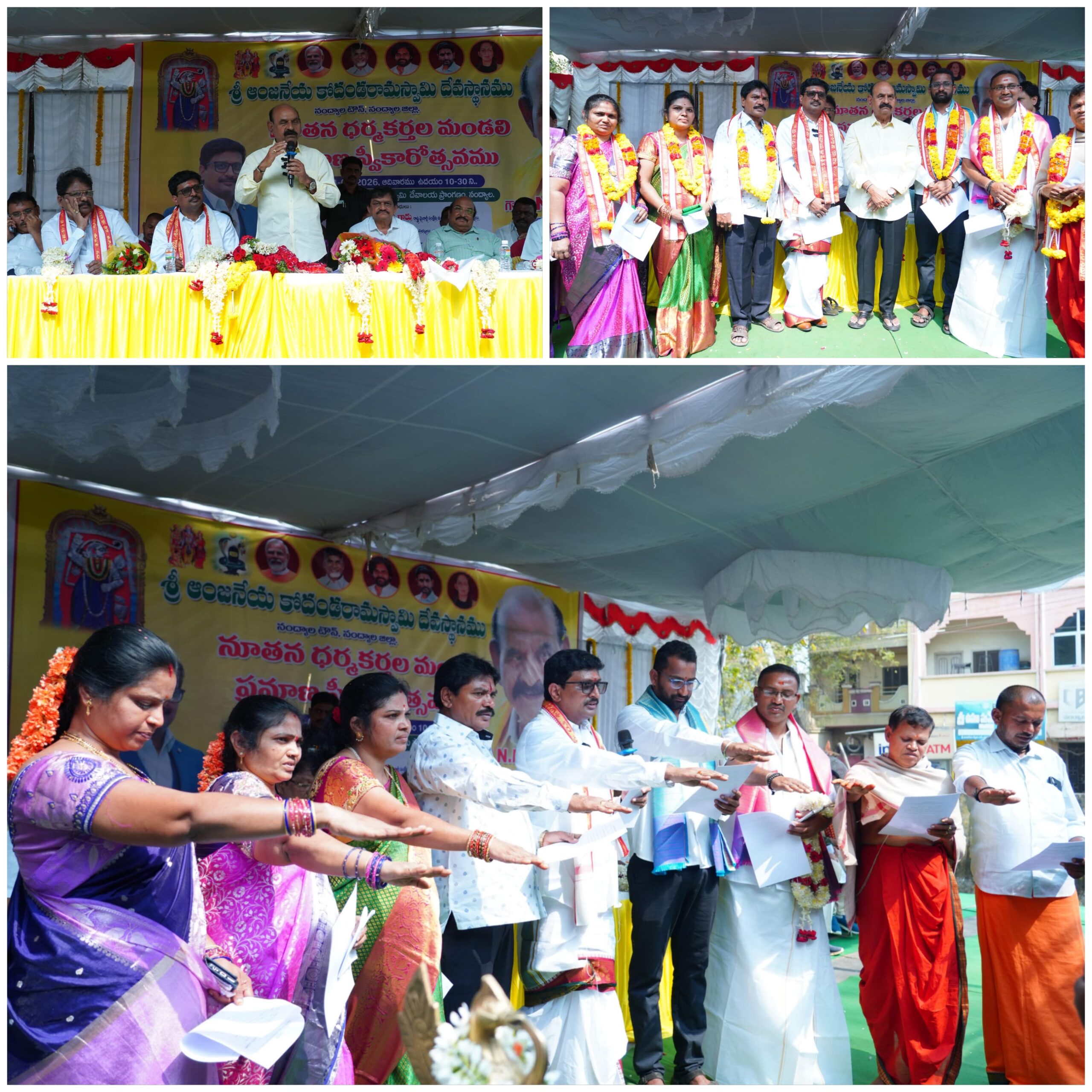 ఆదివారం నంద్యాల బస్టాండ్ సమీపంలో ఉన్న పురాతనమైన, ప్రముఖ గుడి శ్రీ ఆంజనేయ కోదండ రామస్వామి దేవస్థాన నూతన ధర్మకర్తల మండలి ప్రమాణ స్వీకారం ఘనంగా నిర్వహించారు.ఈ కార్యక్రమంలో ముఖ్యఅతిథిగా రాష్ట్ర మైనారిటీ సంక్షేమ మరియు న్యాయశాఖ మంత్రి ఎన్ఎండి ఫరూక్, గౌరవ అతిధులుగా తెలుగుదేశం పార్టీ రాష్ట్ర కార్యదర్శి వెదుర్ల రామచంద్రరావు, ఐఎంఏ రాష్ట్ర మాజీ అధ్యక్షులు, తెలుగుదేశం పార్టీ నాయకులు, శ్రీ సుంకుల పరమేశ్వరి దేవస్థానం చైర్మన్ డాక్టర్ రవి కృష్ణ, తెలుగుదేశం పార్టీ రాష్ట్ర కార్యదర్శి ఏవిఆర్ ప్రసాద్, జిల్లెల్ల శ్రీరాములు, రోటరీ జిల్లా మాజీ గవర్నర్ కందుకూరి శ్రీరామ మూర్తి పాల్గొన్నారు.
